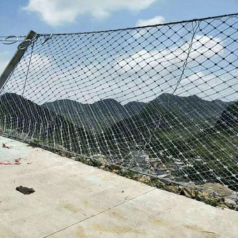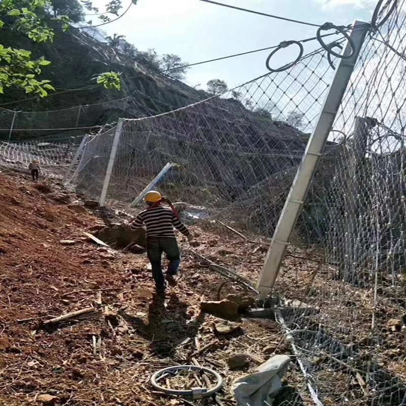 被動邊坡防護網是由鋼絲繩網、環形網、(需攔截小塊落石時附加一層鐵絲格柵)、固定系統(錨桿、拉錨繩、基座和支撐繩)減壓環和鋼柱四個主要部分構成。鋼柱和鋼絲繩網連接組合構成一個整體,對所防護的區域形成面防護,從而阻止崩塌巖石土體的下墜,起到邊坡防護作用。