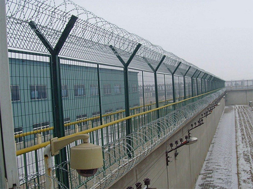 監(jiān)獄鋼網(wǎng)墻的安裝結(jié)構(gòu):V型支架立拄,加強型焊接片網(wǎng),安全防盜連接件和熱鍍鋅刀片刺籠組成。客戶要詳細(xì)說明這些組件的材質(zhì)、規(guī)格,例如監(jiān)獄鋼網(wǎng)墻的刀片刺網(wǎng)是采購不銹鋼304材質(zhì)刀片刺網(wǎng)還是鍍鋅材質(zhì)刀片刺網(wǎng)。V網(wǎng)是否折彎或者增加加強筋,有的客戶為了造價低廉也選擇不用V網(wǎng),而是在Y形柱上焊接刺繩勾,直接把刀片刺繩掛在立柱上,用4根3mm左右鍍鋅絲加固。