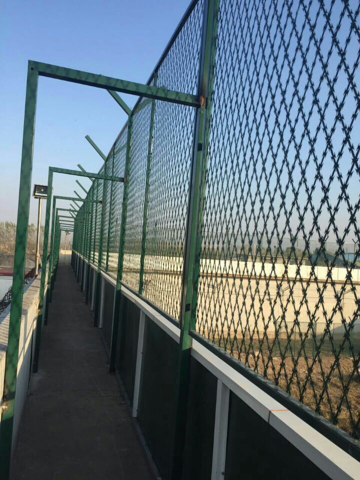 看守所刀刺片鋼網墻、V型支架鋼網墻、定制看守所鋼網墻,監獄鋼網墻采用高強度的刀片刺網與普通防護網的結合,由V型支架立拄,加強型焊接片網,安全防盜連接件和組成。監獄護欄網網格結構簡練、便于運輸、安裝不受地形起伏限制,特別是對于山地、坡地、多彎地帶適應性極強。螺旋型交叉刀片刺網是在兩條刀片刺網之間以不銹鋼片和鍍鋅鋼片強力夾扣,展開后即呈交叉狀,美觀又實用。
