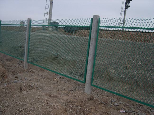 鋼板網防護柵欄價格_鋼板網防護柵欄廠家15075898878_蒙華鐵路專用。鋼板網防護柵欄供應商,鋼板網防護柵欄立柱采用120*120mm鋼筋混凝土安裝,挖基礎回填水泥固定后,將鋼板網防護柵欄網片固定于立柱兩側,采用螺栓連接,我公司現已接蒙華鐵路數個標段訂單,有著豐富的生產和發貨經驗,可為廣大客戶提供質優價廉的產品和周到的售后服務,鋼板網防護柵欄是適用于鐵路防護,高度1.8米和2.2米的一種防護柵欄,該產品采用鋼板沖壓拉伸網經校平后焊接在邊框40*40*4.0mm角鋼,經過精密焊接打磨處理而成。該網片網孔節距為55*120mm,板厚3.0mm,表面處理采用浸塑工藝,浸塑厚度0.8-1.2mm。