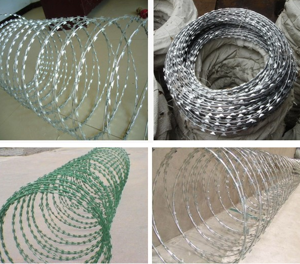 圍墻安全防護(hù)刀刺滾網(wǎng)特 點(diǎn):圍墻安全防護(hù)刀刺滾網(wǎng)又名刮刀型刺絲,是一種近年發(fā)展起來的防護(hù)、隔離能力較強(qiáng)的新型防護(hù)網(wǎng)產(chǎn)品。它采用鋼板沖壓成型包附于鋼絲(筋絲)之上,由銳利尖角鍍鋅鋼板或不銹鋼薄板做刀片,高張力鋼絲做芯線組合而成的。鋒利的刀型刺由雙線扣裝后成蛇腹?fàn)睿让烙^又讓人不寒而栗。起到了很好的阻嚇作用。 用 途:世界各國已將刀片刺網(wǎng)廣泛用于軍事重地、監(jiān)獄、政府機(jī)關(guān)、銀行;生活小區(qū)圍墻、私人住宅、別墅的圍墻、門窗、高速公路、鐵路護(hù)欄以及邊境線等防護(hù)保安。