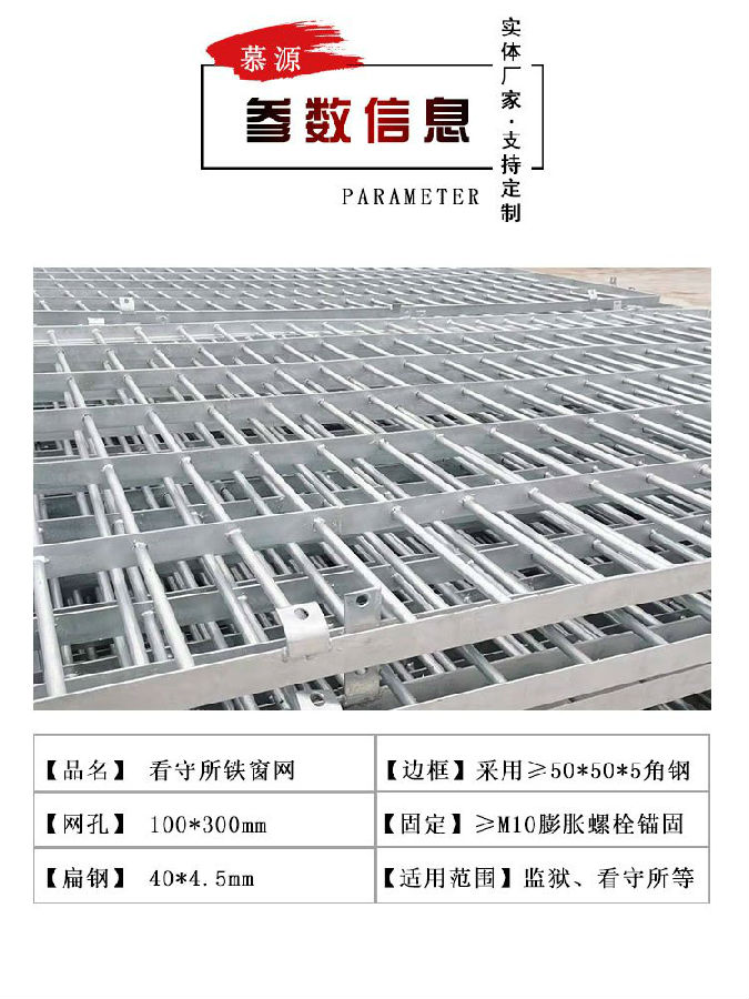 監獄防護窗柵欄,看守所鐵窗護欄,邊框一般為L50*50*5mm角鐵,扁鋼40*4.5mm,鋼筋采用φ18-25mm,網孔常規10*30cm,支持訂做,表面處理為熱鍍鋅或浸塑。
