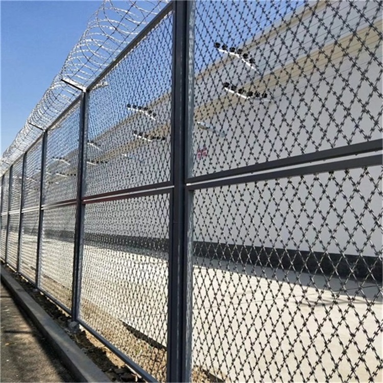 軍人訓練基地場區圍欄網為了提高訓練效率和質量需要一個全封閉的場所。這種場區圍欄網需要措配使用蛇腹形刀刺網形成一段安全 防御護網。下面的圍欄網使用強度好的鋼絲焊接,頂部再搭配刀刺網為軍人訓練營造一個好的封閉環境,是由V型支架立柱增強型焊 接片網,平安防匪件和熱鍍鋅刀片刺籠構成強度和平安性級別很高。比年來,被遍及機場,軍事等平安。注:若是訓練基地場區圍欄網頂 部加裝刀片刺絲、刀片刺繩后又很好的加強了寧靜防護機能。接納電鍍、熱鍍、噴塑、浸塑等防腐情勢,具有很好的*老化、*曬 *候等特性。其產物、花色多樣,既起到圍欄感化,又起到美化感化。因為具有寧靜性高、防攀爬才能好,網片毗鄰特制SBS緊扣件, 有用人為的損壞性拆卸橫向四講折彎增強筋,使網面強度明顯。機場航空人員訓練基地場區圍欄網需要一個足夠的飛機場來訓練,為了營造封閉環境防止外來人員和動物進入影響訓練,還有附近人 員的生命安全,需要安裝以前場區圍欄網,我們也叫機場隔離網,圍界網等。